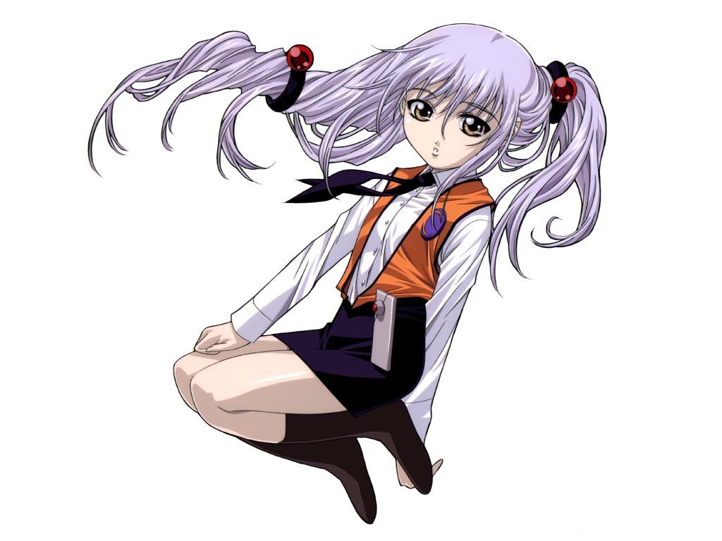 Description: A girl with long white hair and a tie on sitting on the ground with her legs crossed and her hair flying in the air.