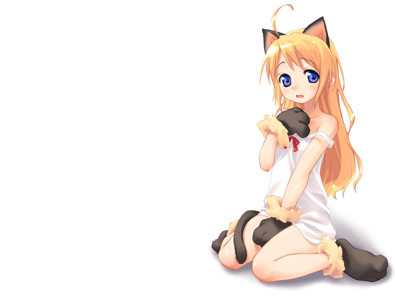 Description: A girl with long hair sitting on the ground with a cat ears on her head and a black and white cat tail on her head.