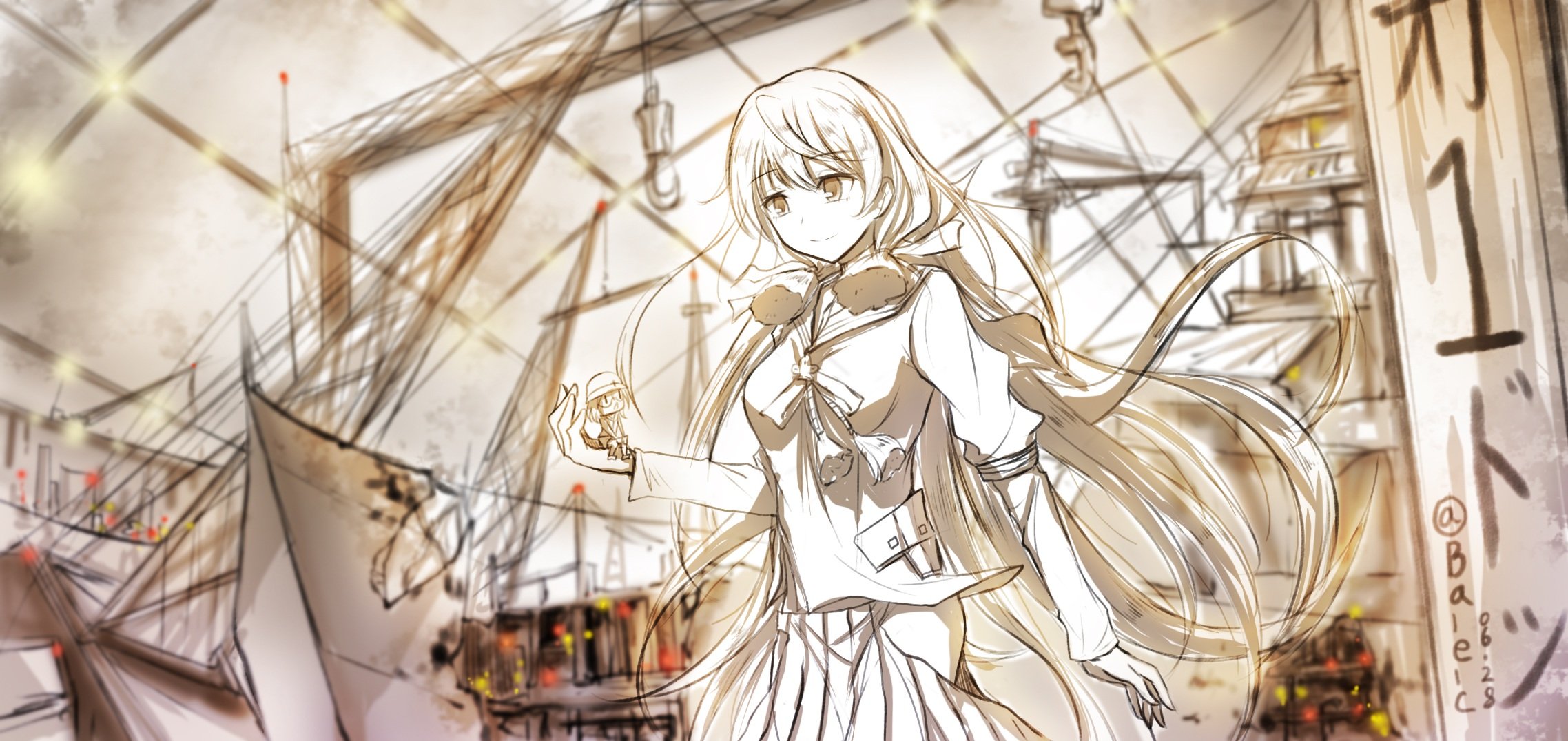 Description: A drawing of a girl with long hair and a sailor outfit holding a bottle of beer in a city.