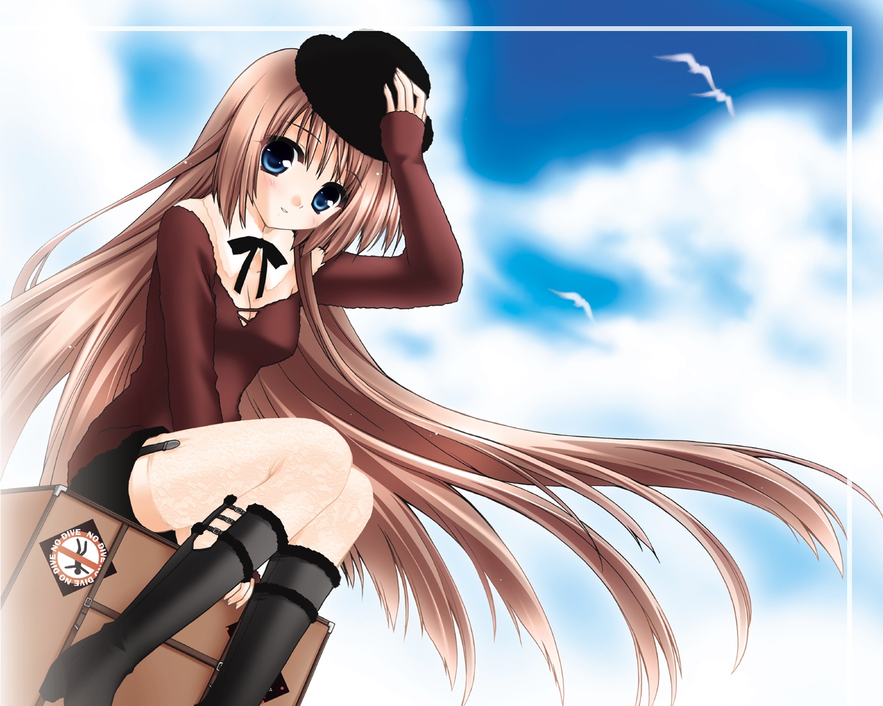 Description: A girl with long hair sitting on a suitcase with her hand on her head and a sky background with clouds.