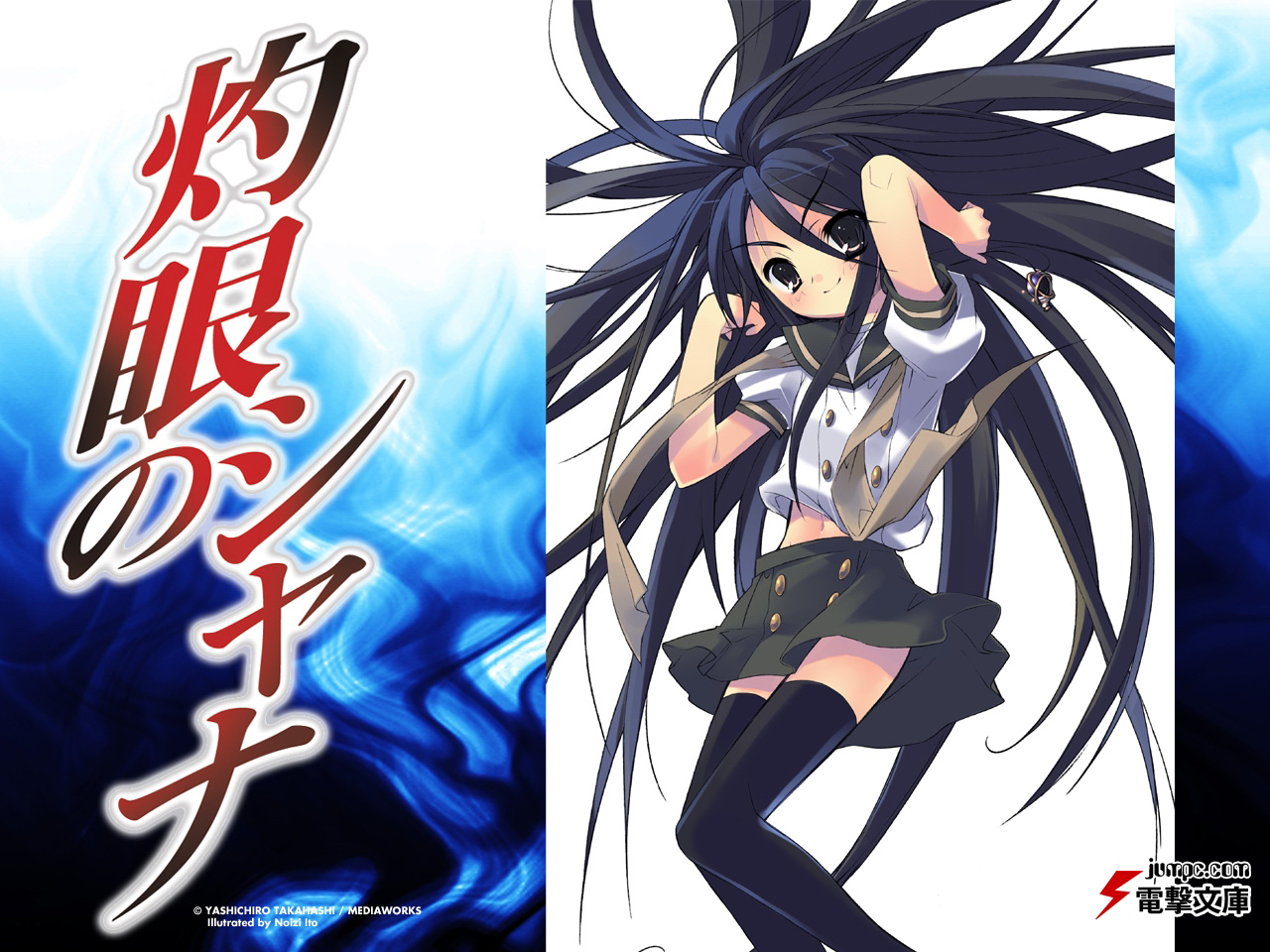 Description: A girl with long hair and a white shirt and black skirt is standing in front of a blue background.