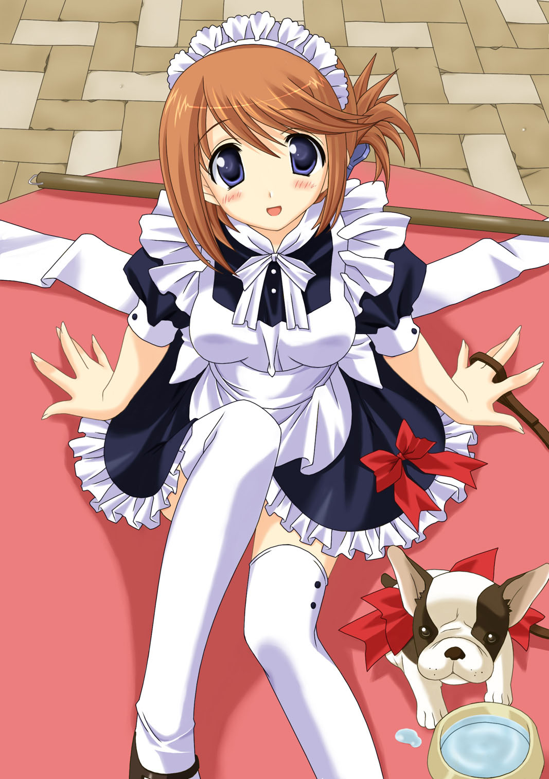 Description: A girl in a maid outfit is laying on a bed with a dog nearby and a broom in her hand.