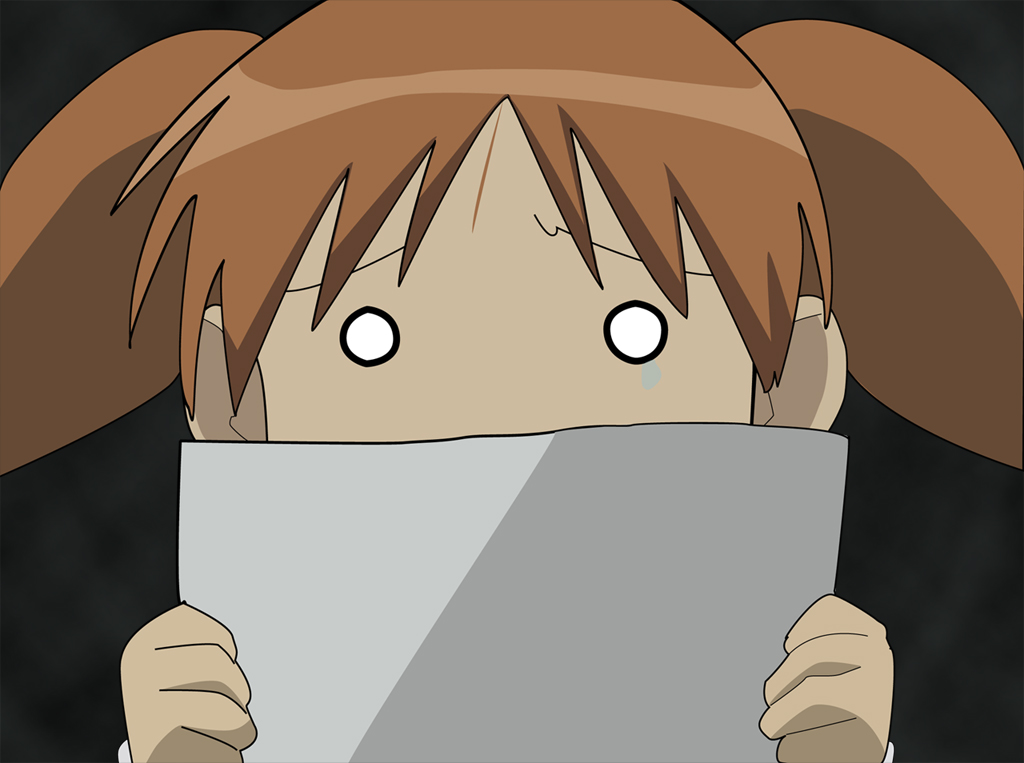 Description: A girl with a paper in her hand and eyes wide open.