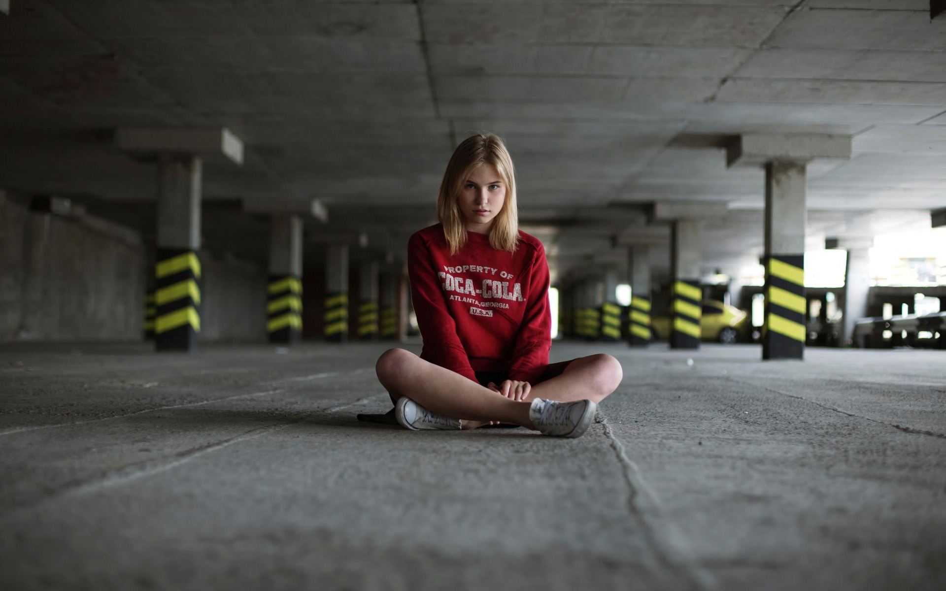 Description: A girl sitting on the ground in a parking garage with her legs crossed and her shirt tucked up in front of her.