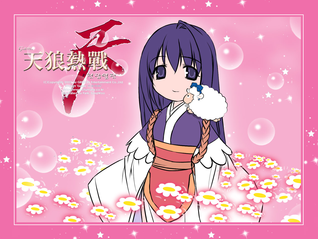 Description: A girl with long hair and a pink background with daisies and a pink frame with a white cat.