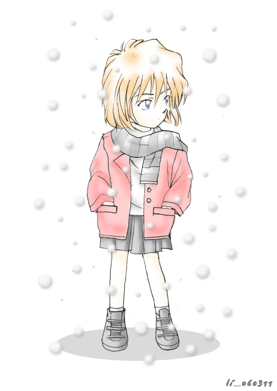 Description: A drawing of a girl in a pink coat and grey sweater standing in the snow with her hands on her hips.