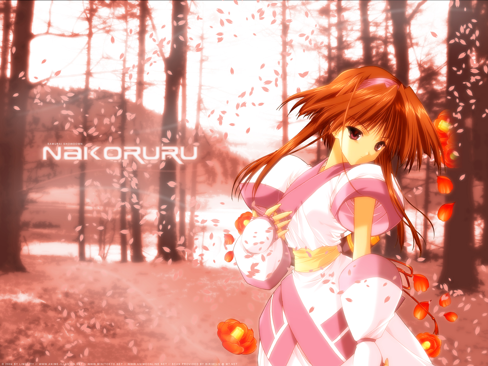 Description: A girl in a pink dress standing in a forest with trees and leaves around her and a pink ribbon around her neck.