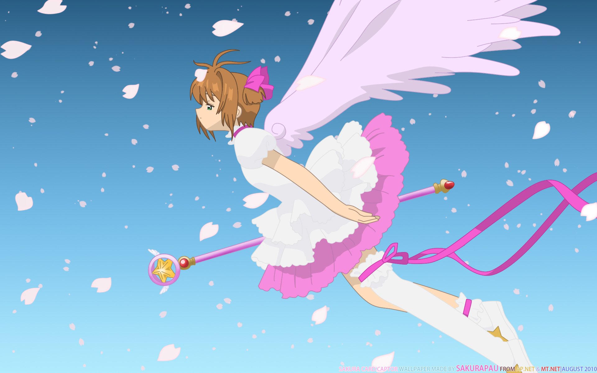 Description: A girl in a pink dress with a pink ribbon around her neck and a pink angel wings on her back.