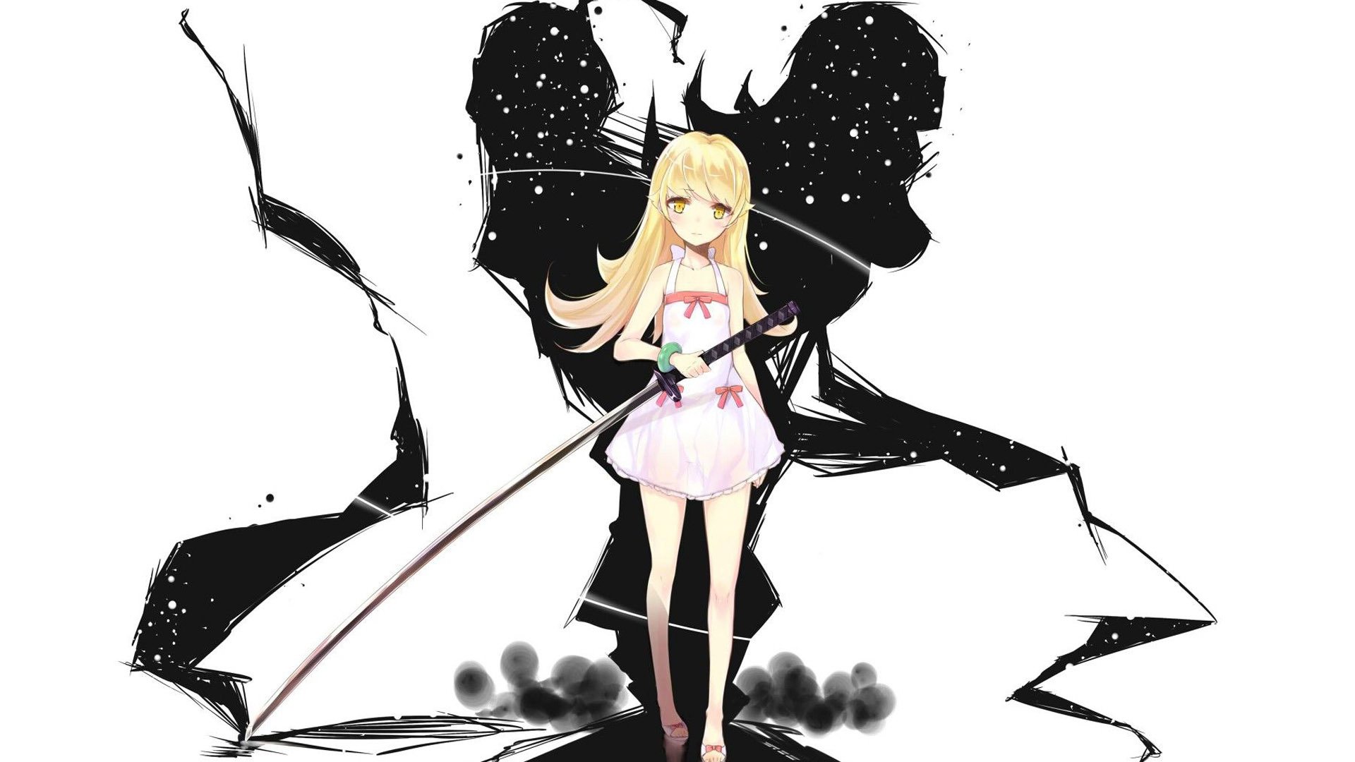 Description: A girl in a pink dress holding a sword in front of a black demon with a white tail and a pink dress.