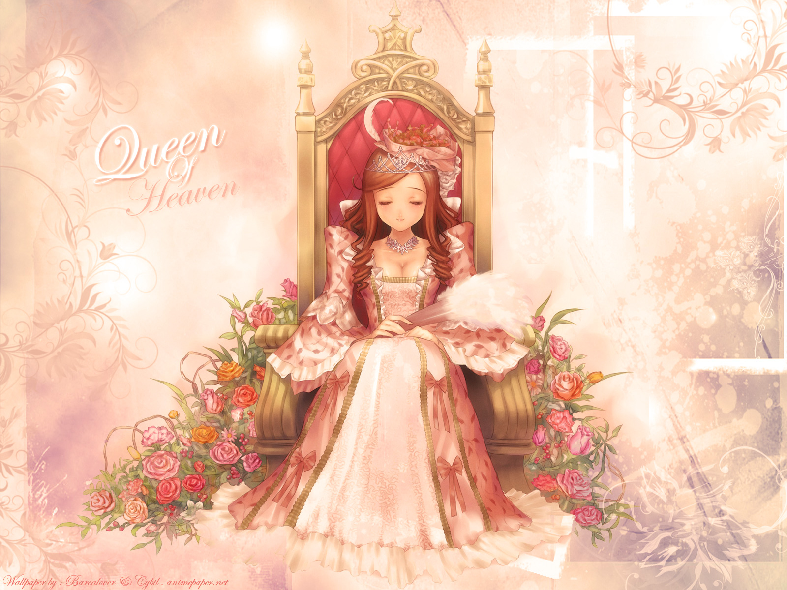 Description: A girl in a pink dress sitting on a throne with flowers around her and a tiara on her head.