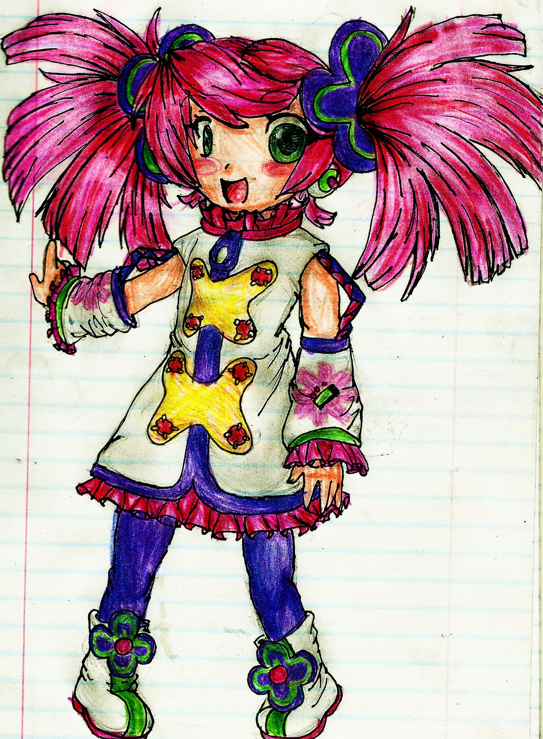 Description: A drawing of a girl with pink hair and a hat on her head and a pair of roller skates.