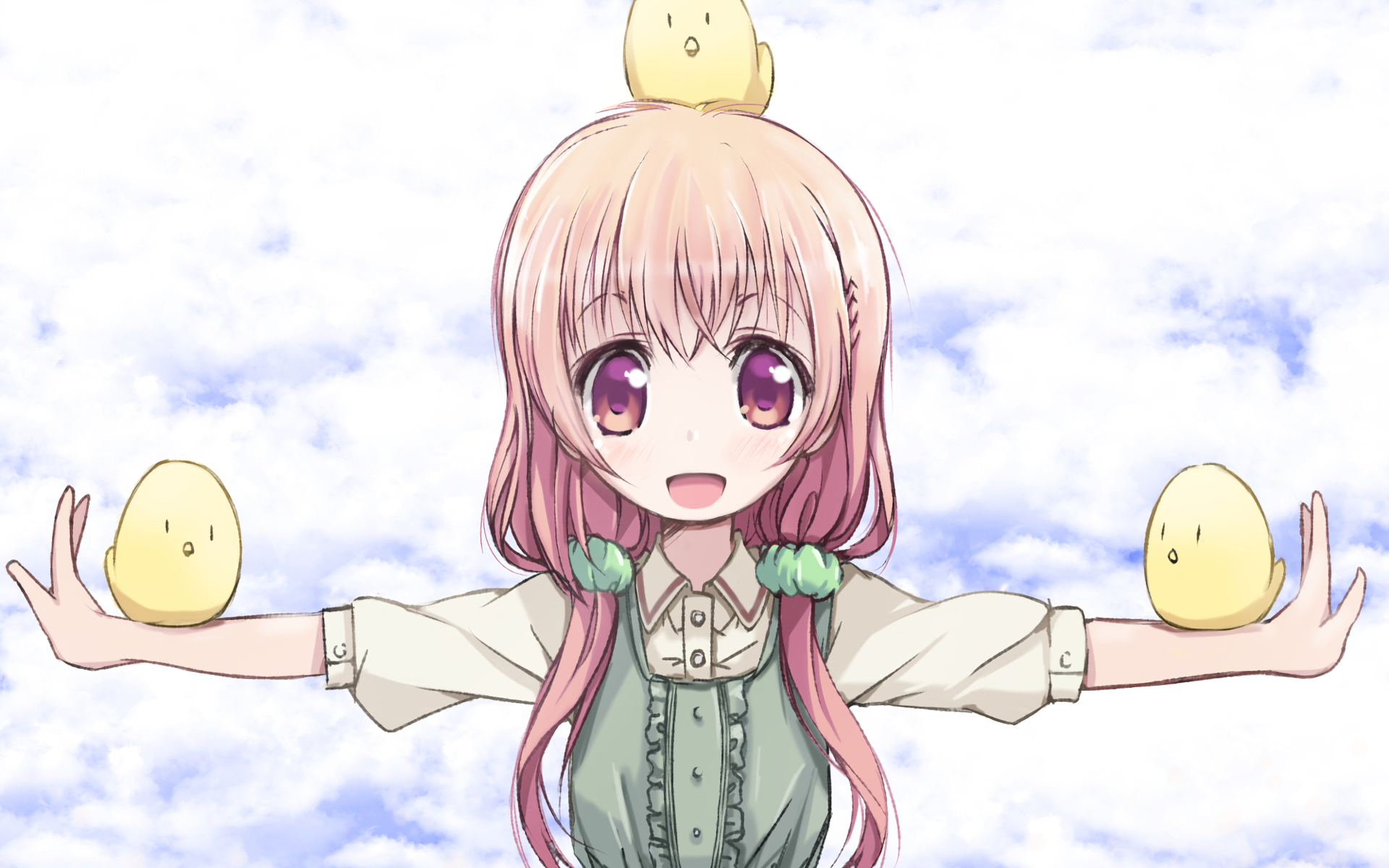 Description: A girl with pink hair holding two eggs in her hands and wearing a green dress and a crown on her head.