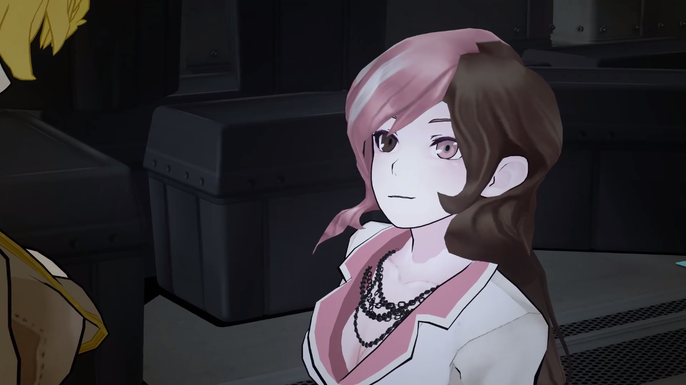 Description: A girl with pink hair and a man with a pink shirt and tie standing next to each other in a dark room.