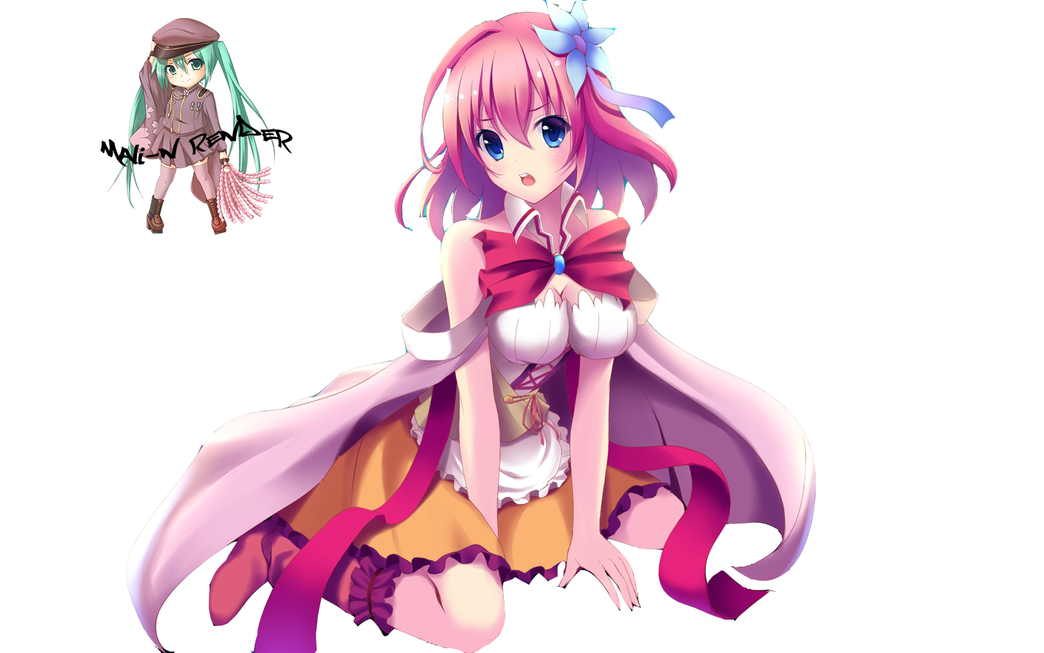 Description: A girl with pink hair and a pink outfit with a bow on her head and a pink cape over her shoulder.
