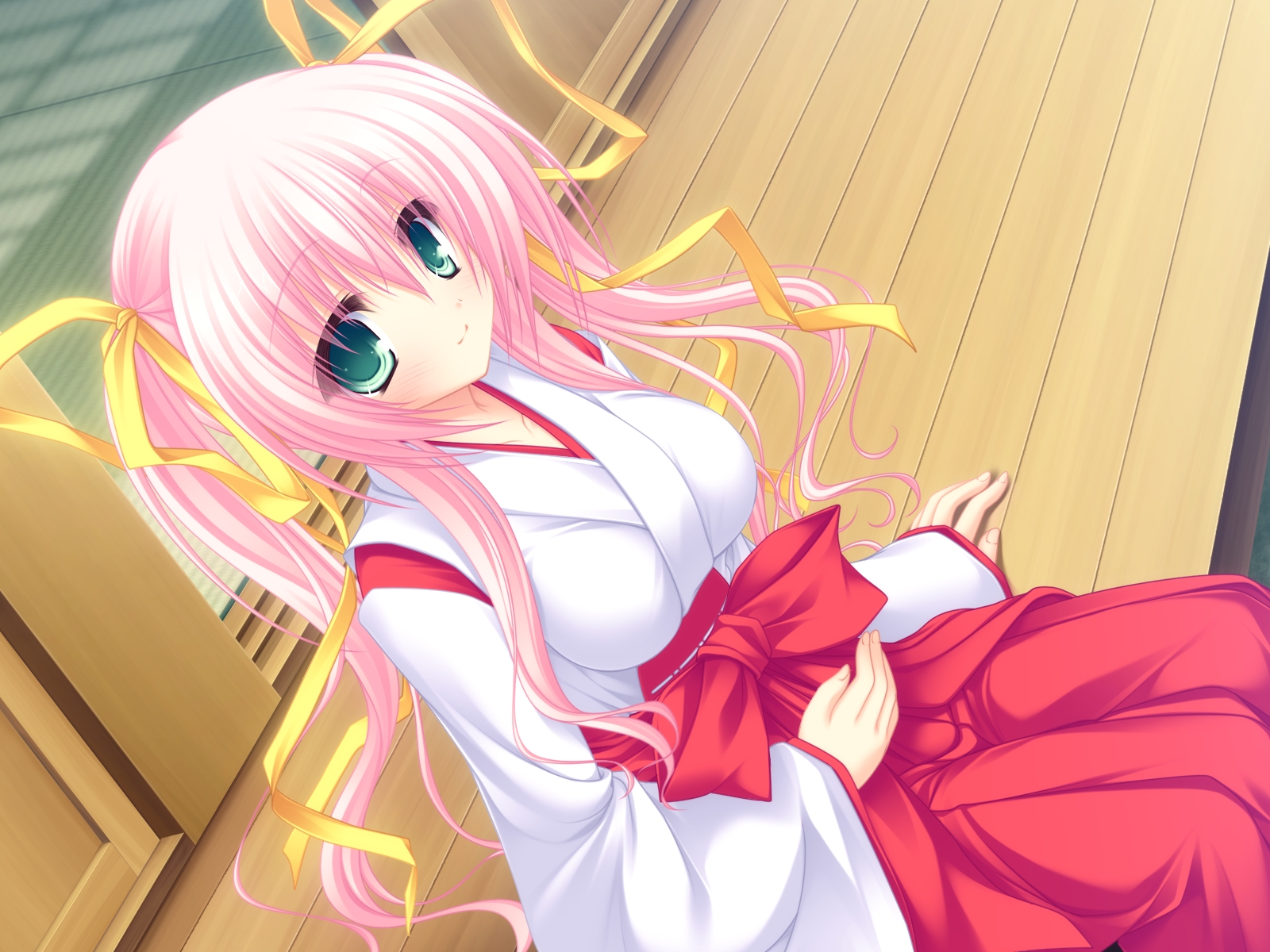 Description: A girl with pink hair and a red dress is standing in front of a building with a red bow.