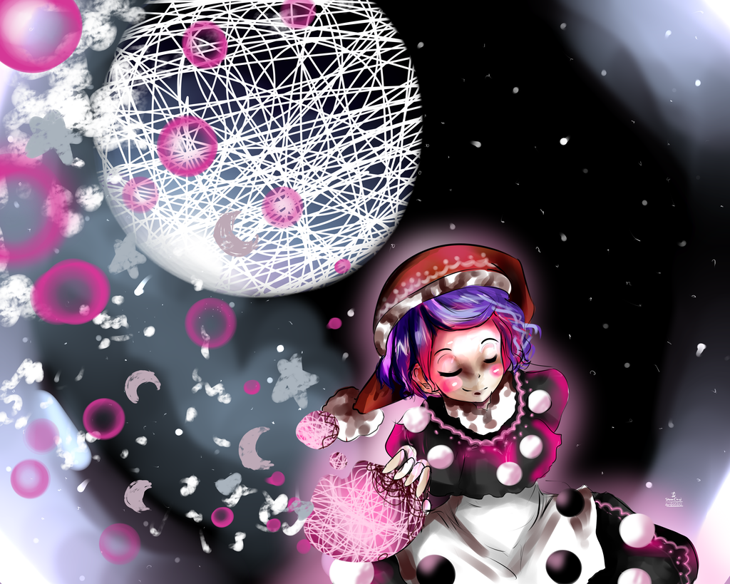 Description: A girl with a pink hat and polka dot dress holding a pink ball in front of a white ball.