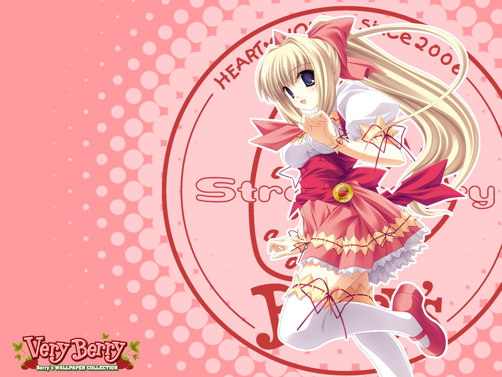Description: A girl in a pink dress with a red bow on her head and a pink background with a red bow around her neck.