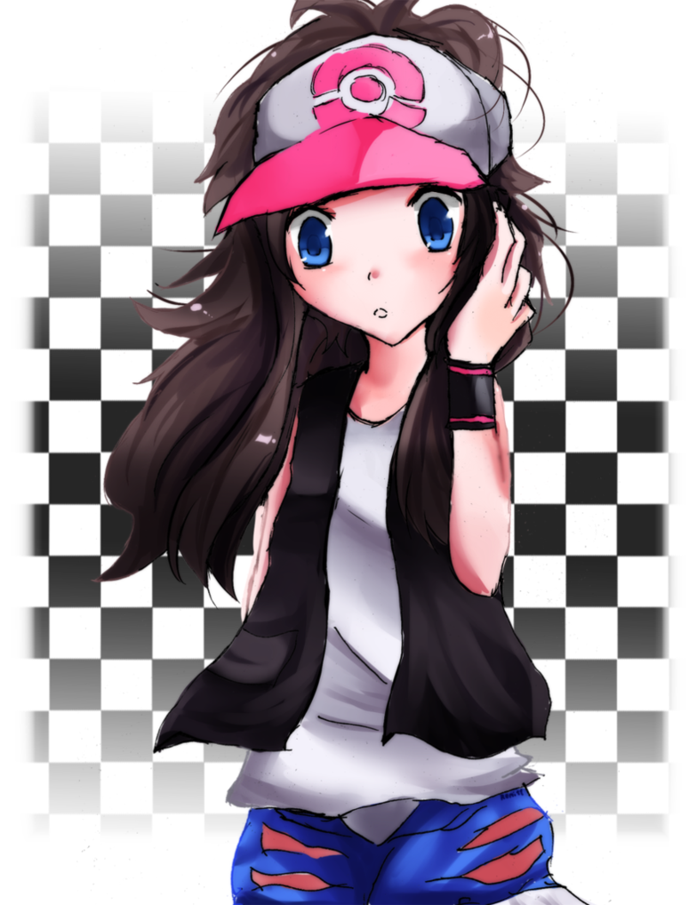 Description: A girl with a pink hat and blue jeans sitting on a checkered background with her hand on her head.