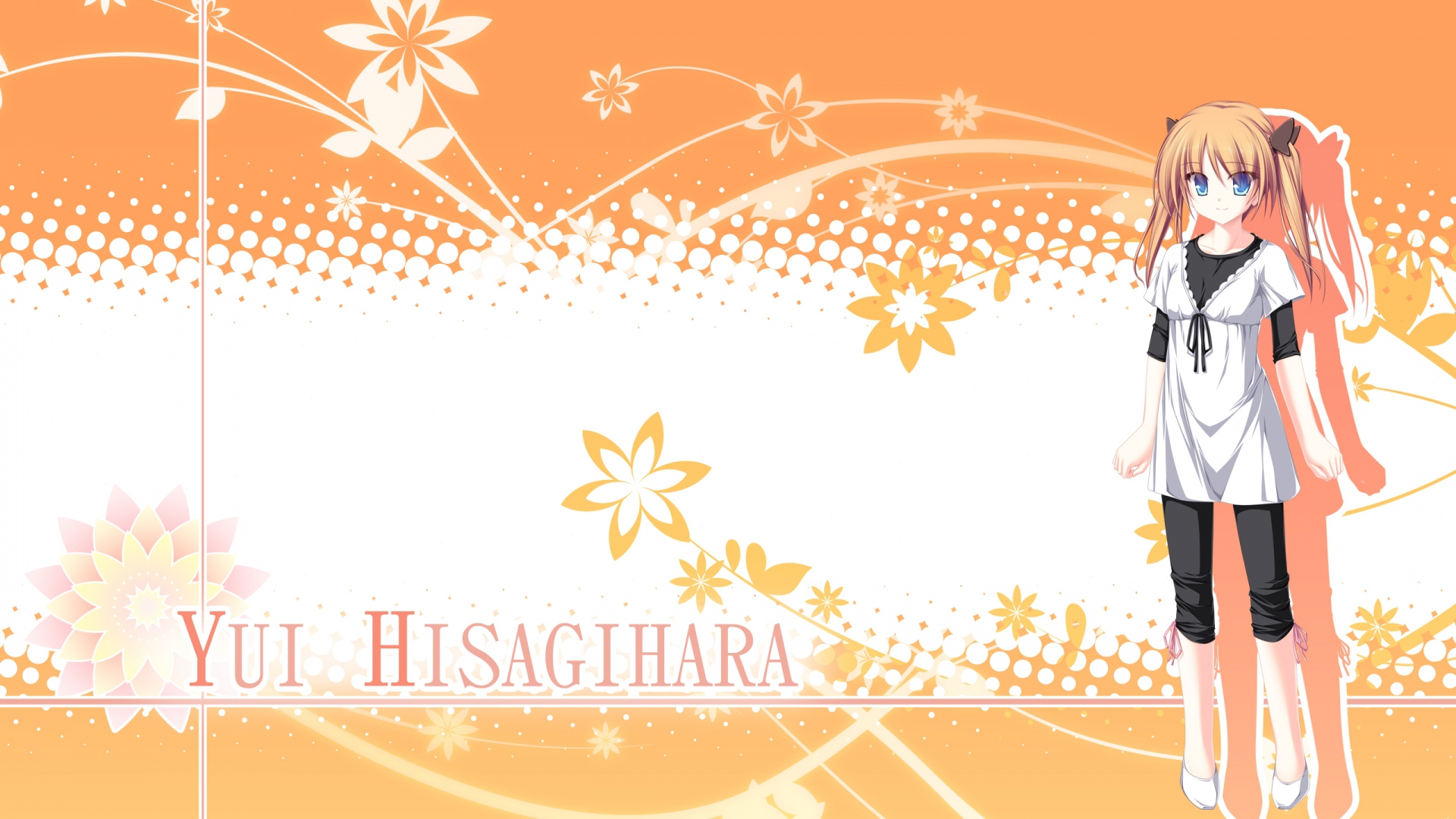 Description: A girl with a ponytail standing in front of a floral background with a name tag on it that says yui hisagara.