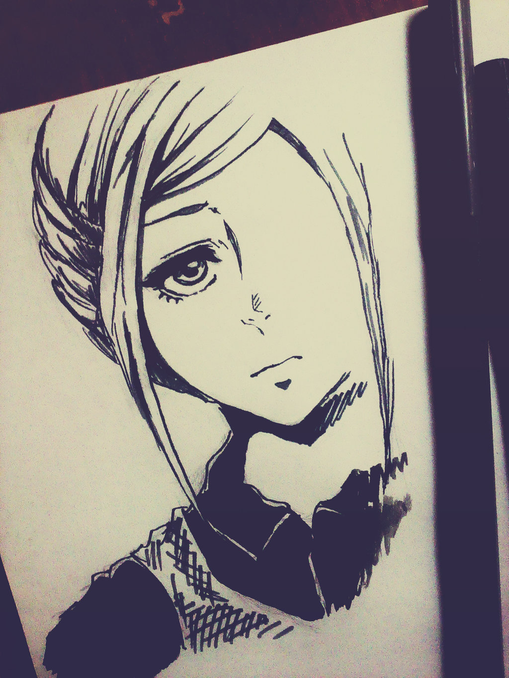 Description: A drawing of a girl with a ponytail and a shirt on.