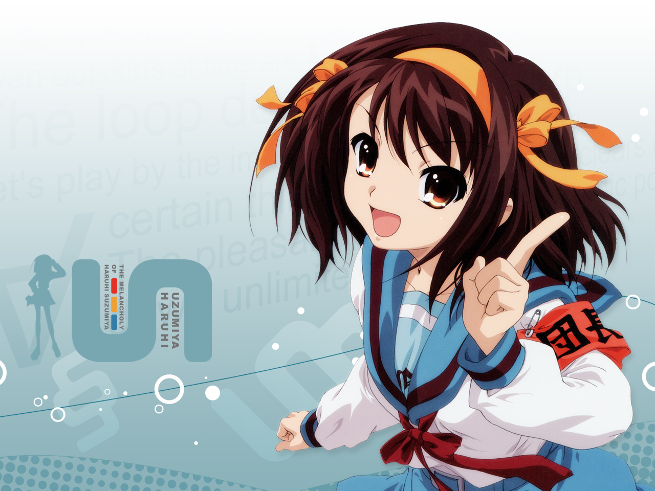 Description: A girl with a ponytail pointing at the camera with a smile on her face and a blue background with a white and red design.