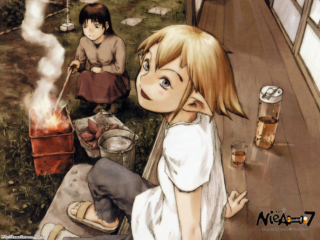 Description: A girl sitting on a porch next to a fire with a boy sitting on the ground next to her.