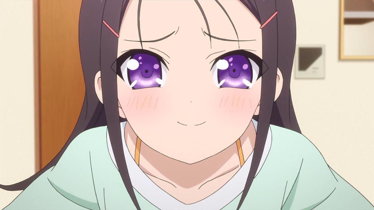 Description: A girl with purple eyes and long hair looks at the camera with a smile on her face and a green shirt on.