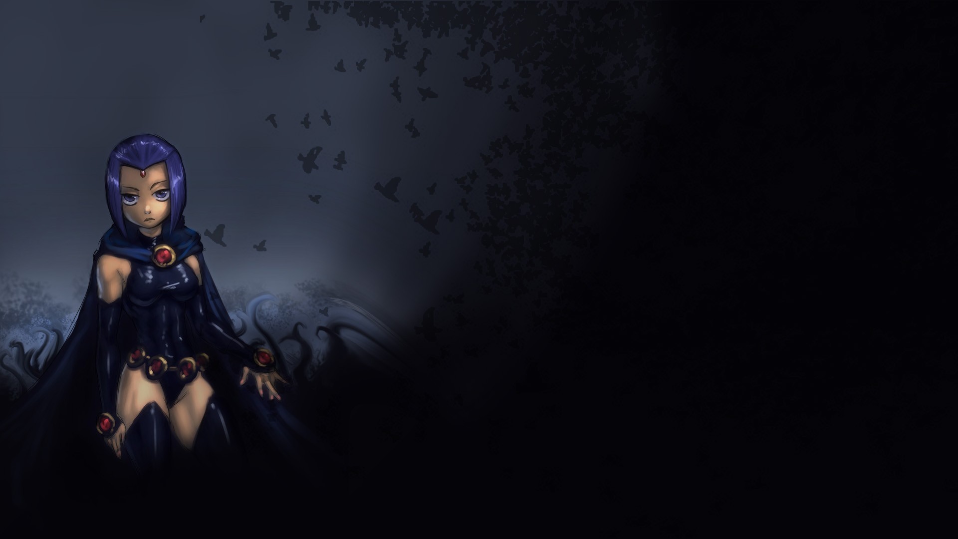Description: A girl with purple hair and a black cape is standing in the dark with butterflies flying around her and a black background.