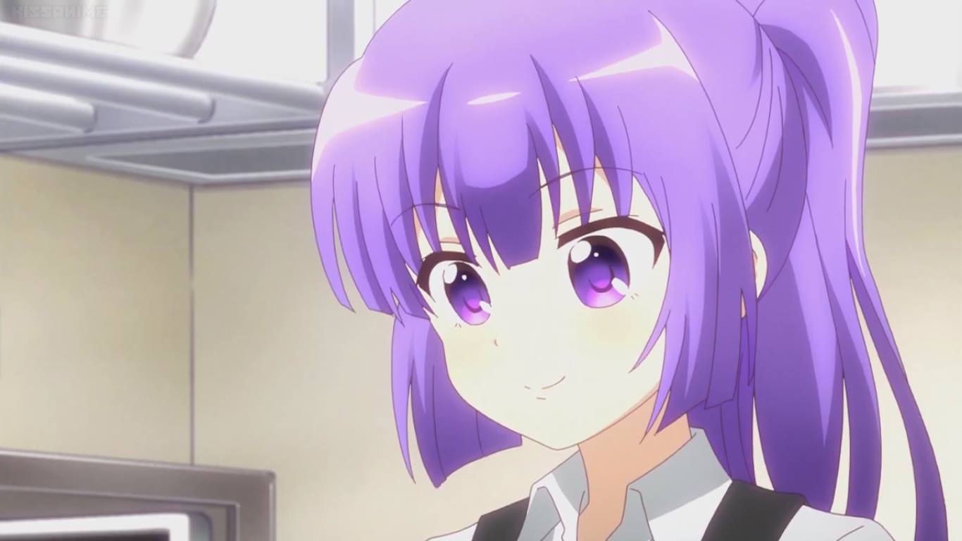 Description: A girl with purple hair and a striped shirt looks at the camera while standing in a room with a microwave.