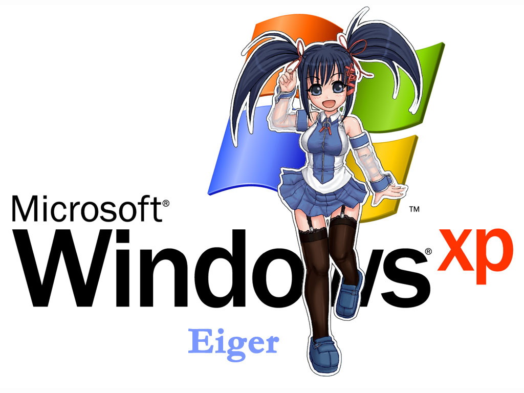 Description: A girl in a short skirt and boots with a rainbow umbrella in front of a microsoft xp logo and a computer logo.