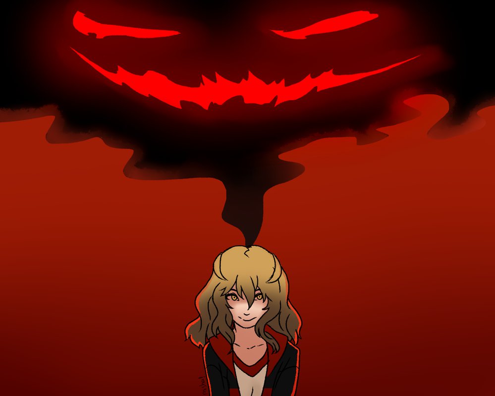 Description: A girl standing in front of a red background with a scary face on it's face and a black background.