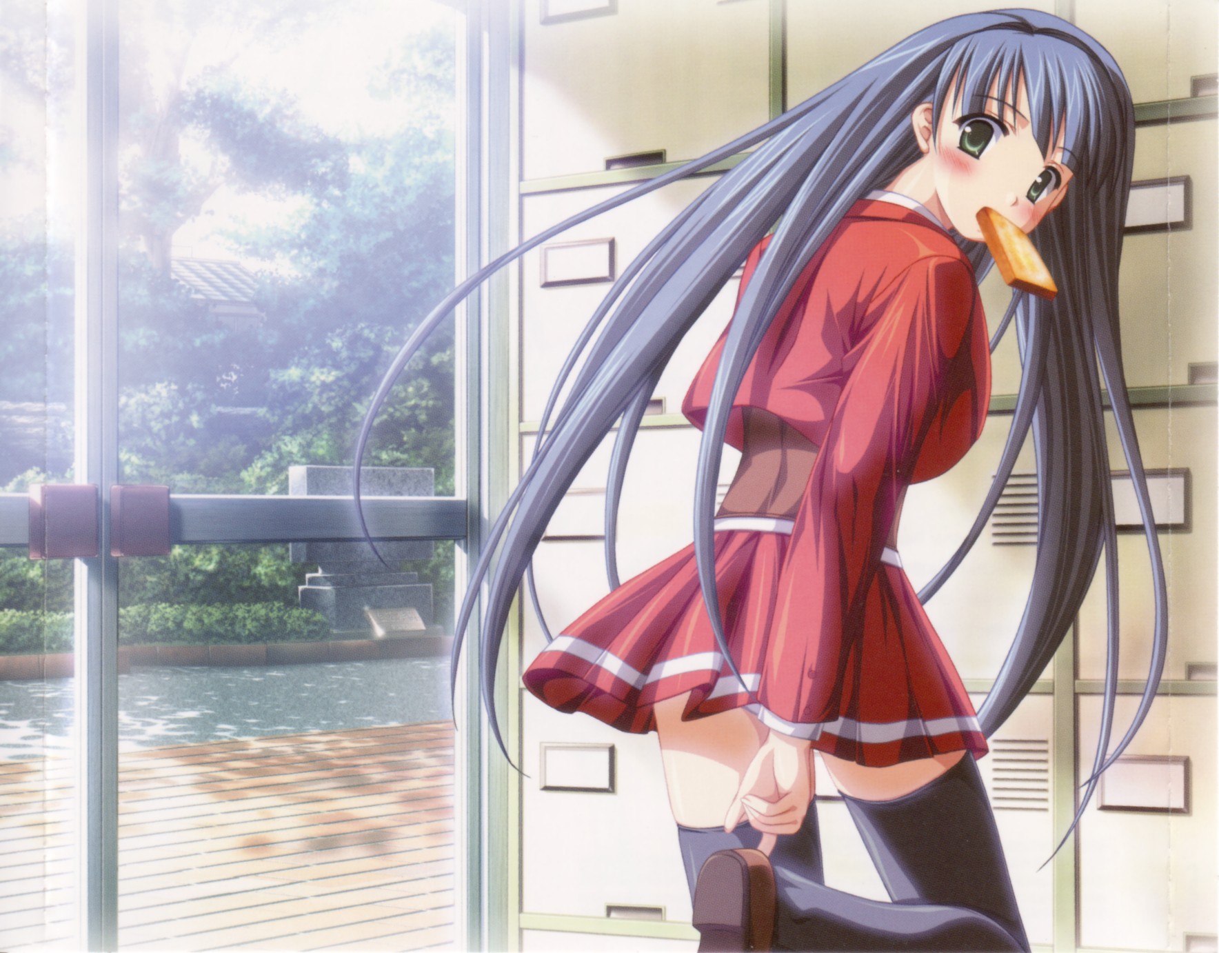 Description: A girl with long hair and a red dress is standing in front of a window with a bird in her mouth.