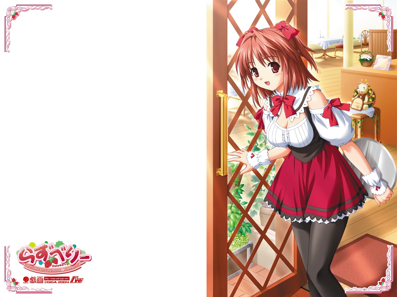 Description: A girl in a red dress is standing in front of a door with a white background and a pink ribbon.