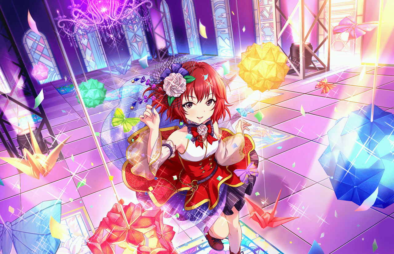 Description: A girl in a red dress is standing in a room with a bunch of objects in it and a purple background.