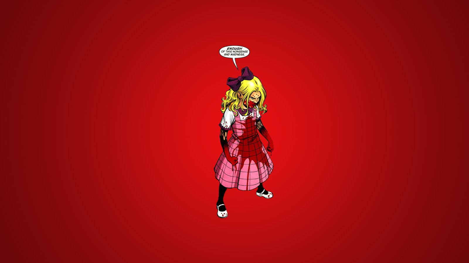 Description: A girl in a red dress with a speech bubble above her head and a red background with a red background.
