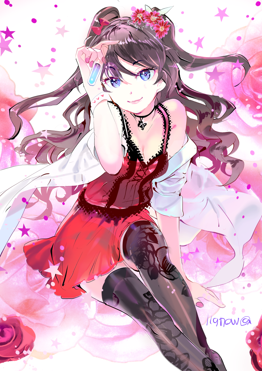 Description: A girl in a red dress with stars on her head and a pink background with stars and a pink rose.