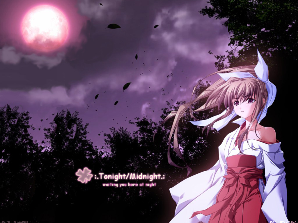 Description: A girl in a red dress standing in front of a tree with a pink sky in the background and a pink sun in the background.