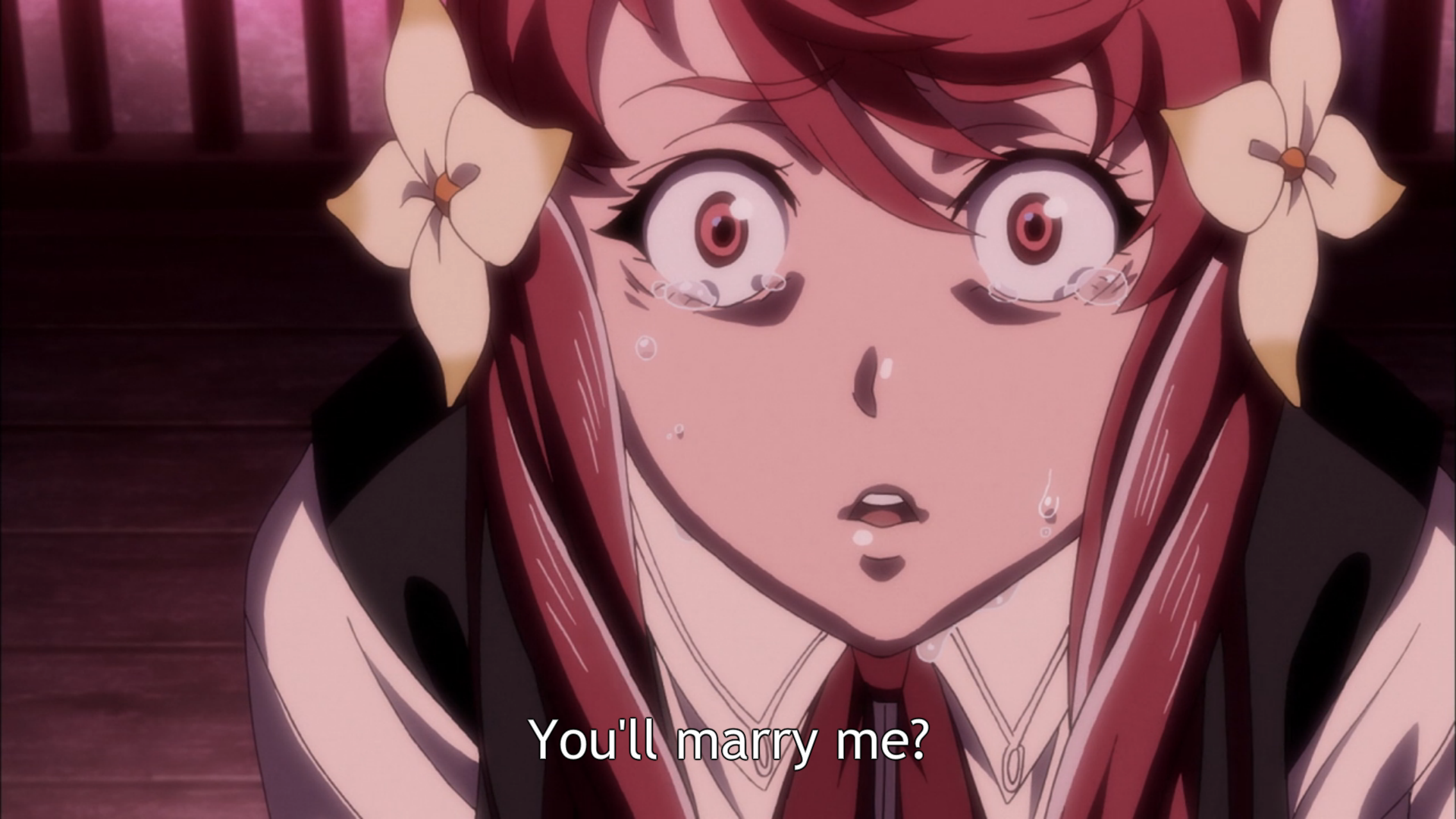 Description: A girl with red hair and big eyes with a sad expression on her face.