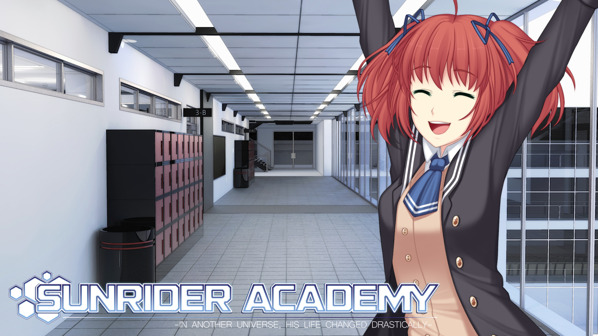 Description: A girl with red hair and a blue shirt is standing in a hallway with her arms up in the air.