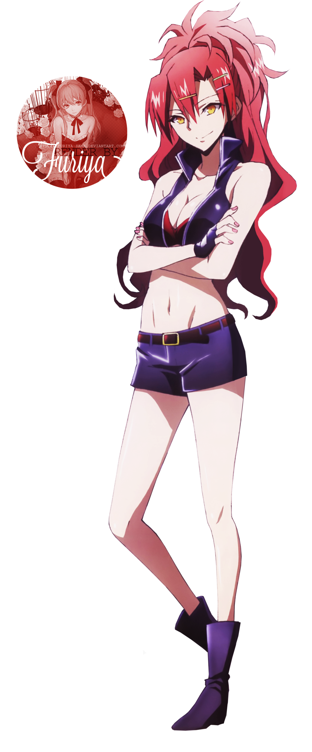 Description: A girl with red hair and boots standing in front of a black background with a red and white sign.