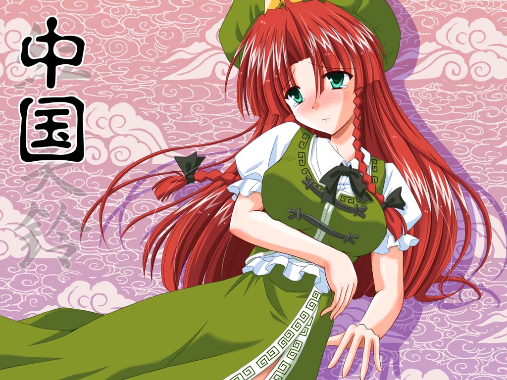 Description: A girl with long red hair wearing a green dress and a hat with a bow on her head and a green dress with a white collar.