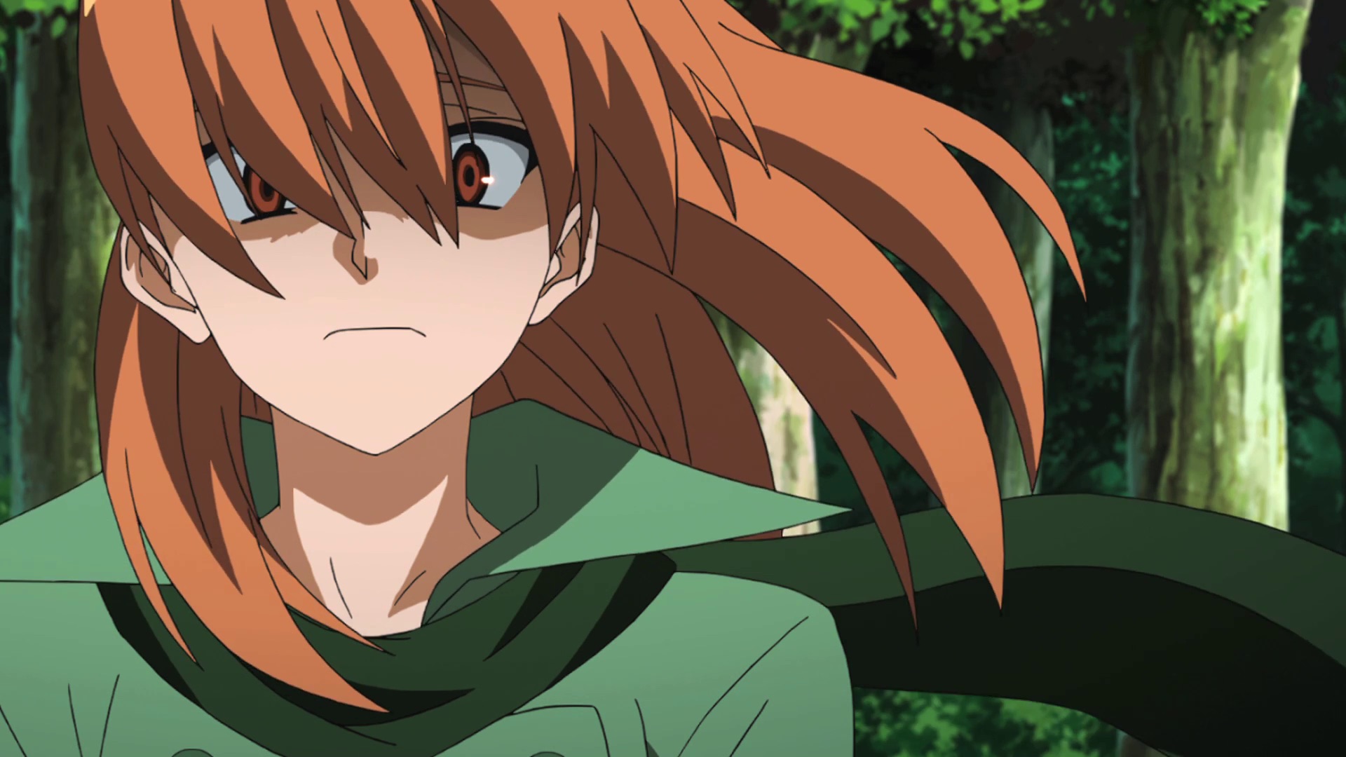 Description: A girl with red hair and a green jacket in a forest with trees and bushes behind her.