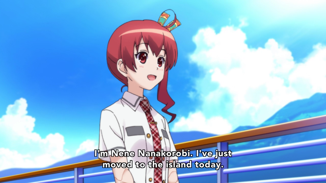Description: A girl with red hair and a tie standing on a balcony with a sky background and a quote from the anime.