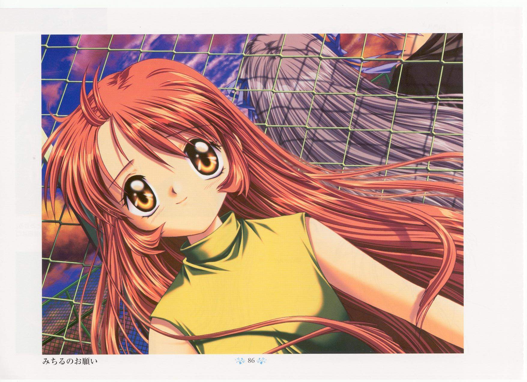 Description: A girl with long red hair and a yellow shirt is standing in front of a wire fence with a bird on it.