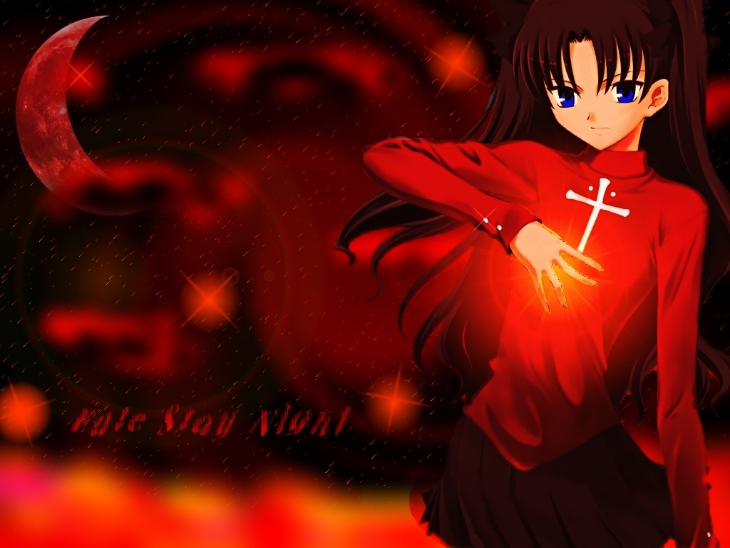 Description: A girl in a red shirt with a cross on her chest and a crescent in the background with a red moon.
