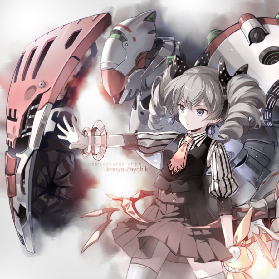 Description: A girl in a dress and a robot suit holding a gun in her hand and another girl in a dress and a helmet behind her.