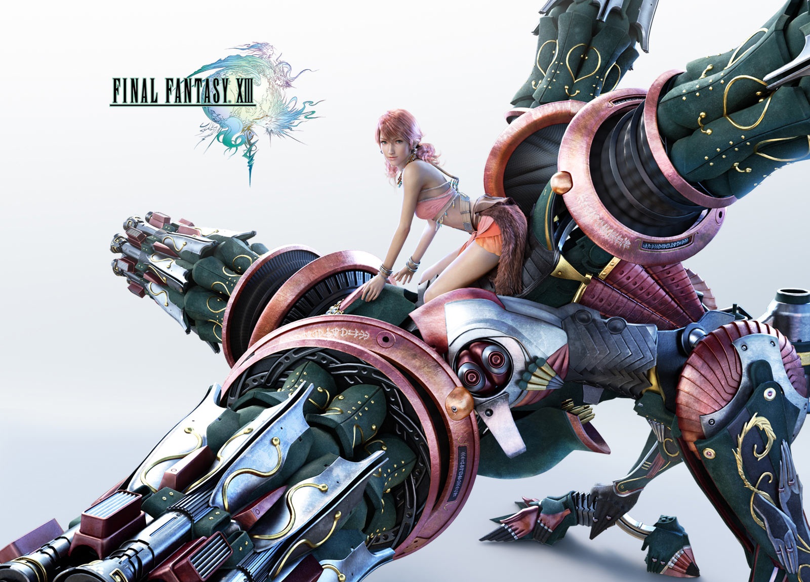 Description: A girl riding on the back of a robot like creature with a sword in her hand and a sword in her other hand.