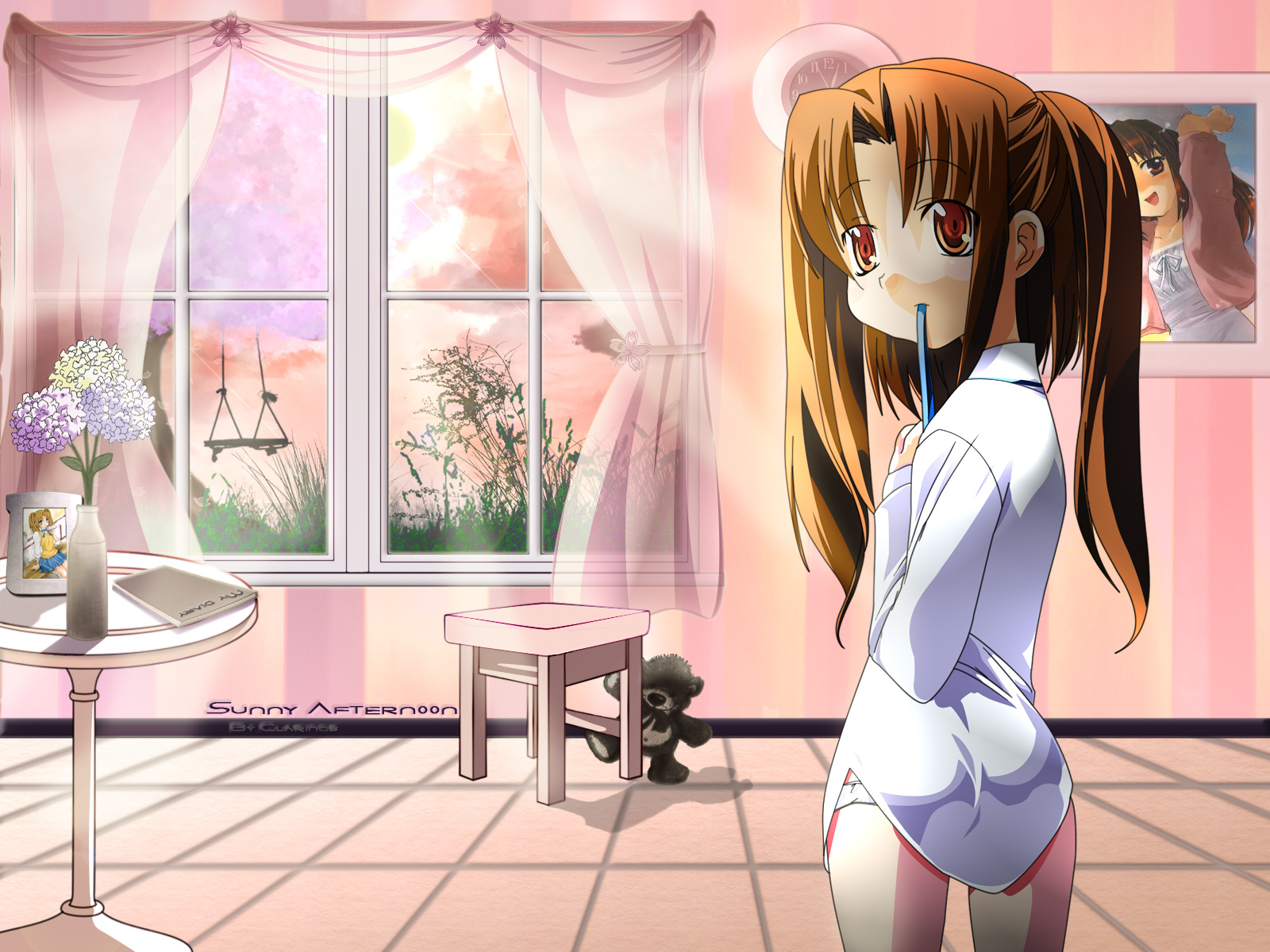 Description: A girl in a room with a table and a window with a view of a woman in a white shirt.