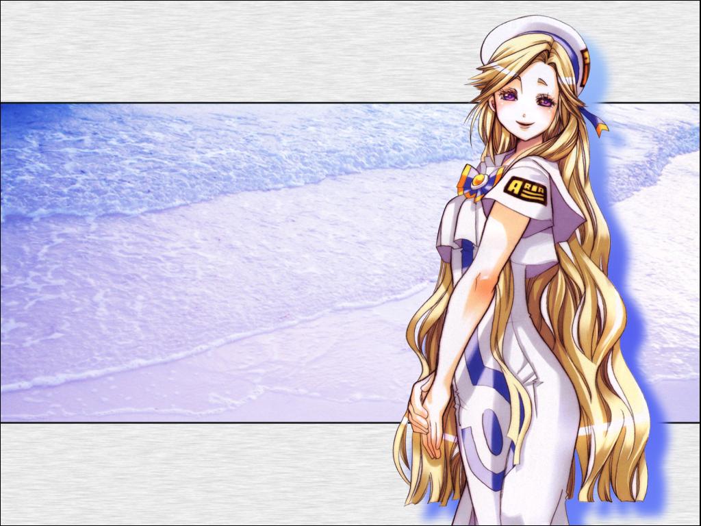 Description: A girl with long blonde hair and a sailor outfit standing on a beach with a blue and white background.