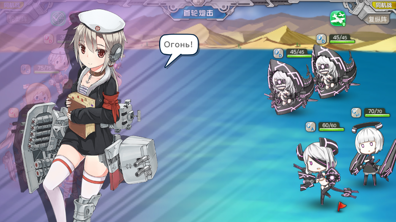 Description: A girl in a sailor outfit is holding a gun and a gun case in front of her face and a cartoon character in the background.